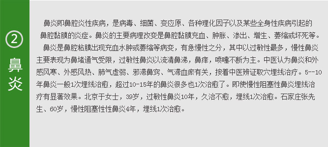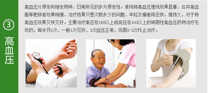 埋线疗法是用特制的埋线针,将用麝香、沉香、木香等名贵中药特殊泡制的医用羊肠线段送进穴位里,通过强而持久的穴位刺激作用治疗疾病的方法,是针灸作用的几十到几百倍,当然麻痛反应比针灸要大些。线段因间隔一定时间后就吸收消失,所以要间隔15~60天埋线一次。具有简单方便、作用持久、效果显著的特点。通过多年的临床研究发现,只要诊断正确,找准穴位,治疗效果特别显著,无效的患者很少。埋线疗法不开刀,不吃药,痛苦小,效果好,已被国家卫生部列为“十年百项”推广项目(见卫科教发【2001】193号文件 ,卫通【2005】14号文件) 。 [更多]